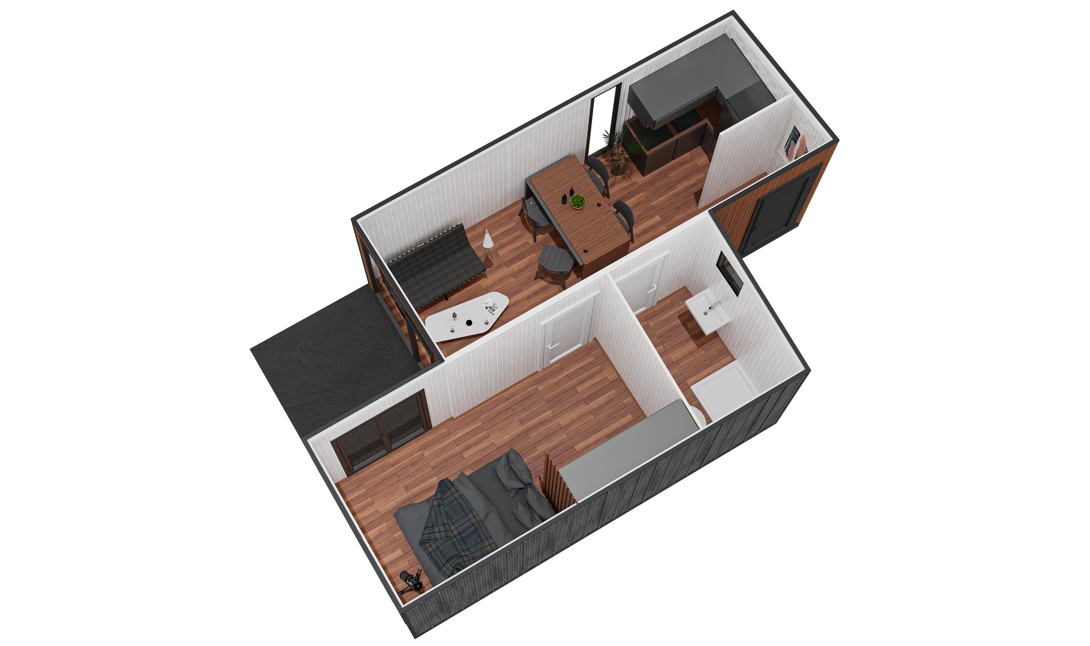 Our housing containers have a wide range of uses and are ideal as guest houses, holiday homes, offices or company accommodations. With their durable and robust design, they withstand rain, wind and other harsh weather conditions. The housing modules are also completely newly built from certified ecological materials, which contributes to reduced construction waste and a sustainable and longer lifespan.